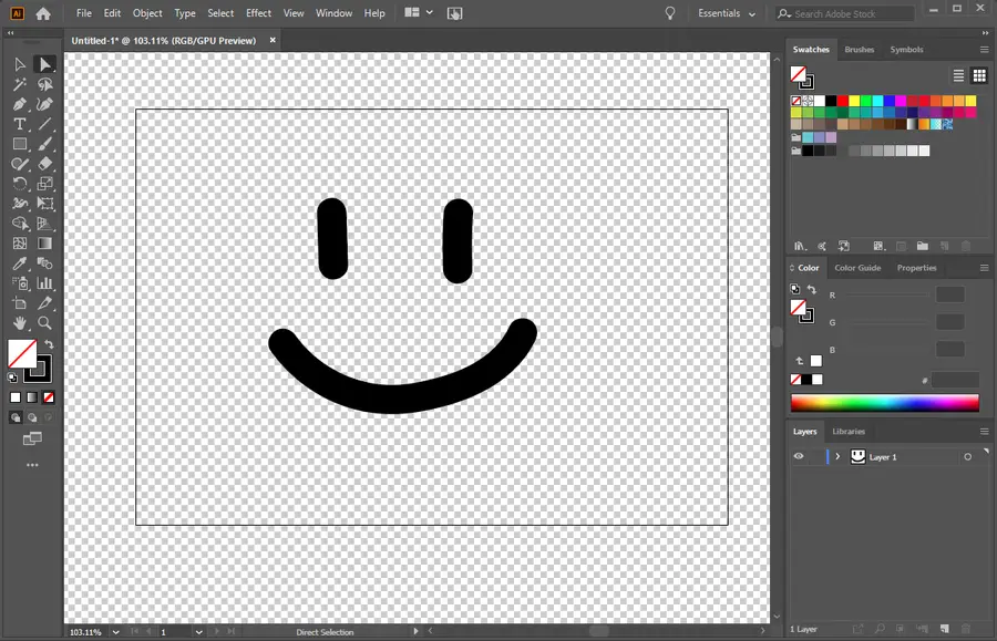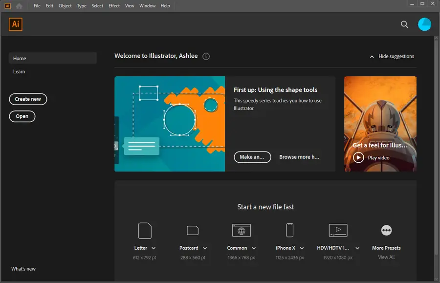 Start a new file in Illustrator by clicking Create new… on the main menu. Alternatively, you can open an existing file to edit in a transparent background. You can drag and drop the file onto the workspace or use the File > Open menu.