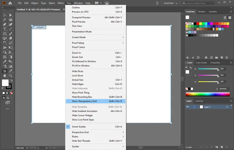 To remove the default white artboard, enable the transparency grid. You can find this setting under the View tab at the top. Select Show Transparency Grid.