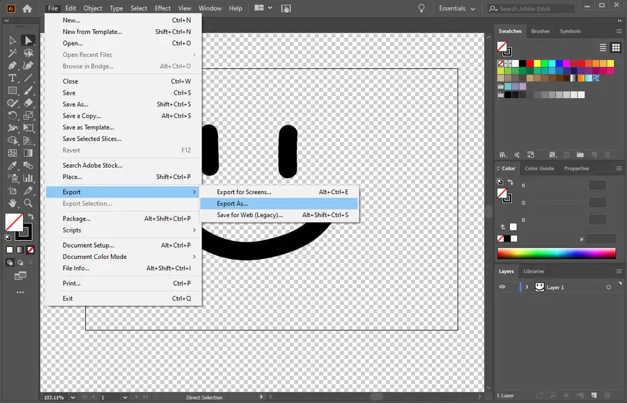 When your design is complete, save the changes with an appropriate file type so the transparency stays in the final product. You can save the image using the File > Export As… menu.