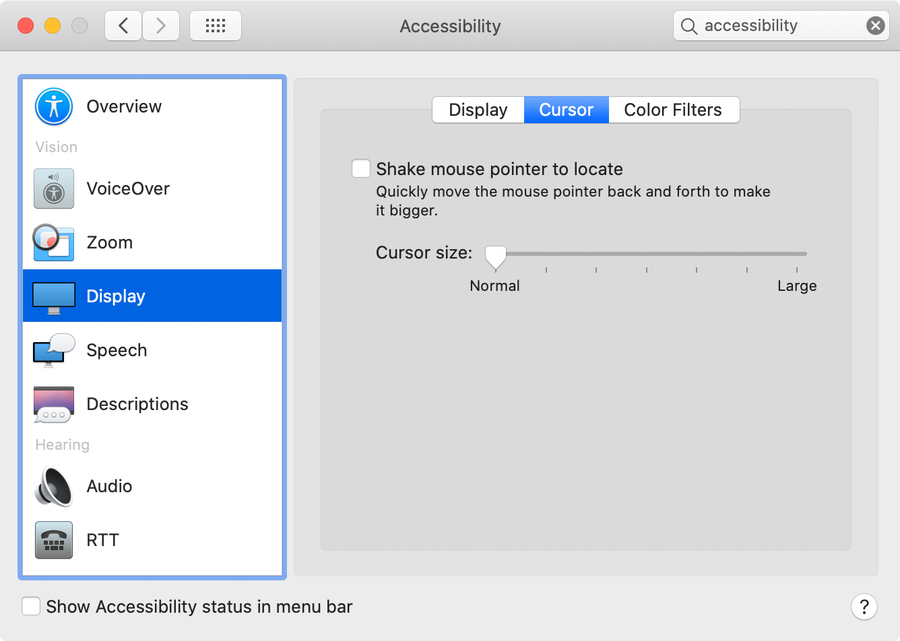 Select Display in the sidebar and then select the Cursor tab.