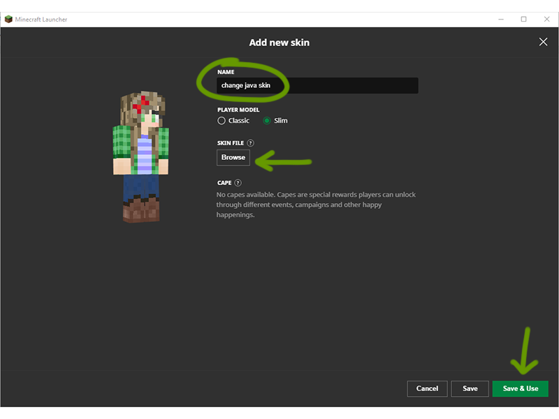 Once ready, click Save & Use. Now, your character will have the new skin on whenever you play Minecraft!