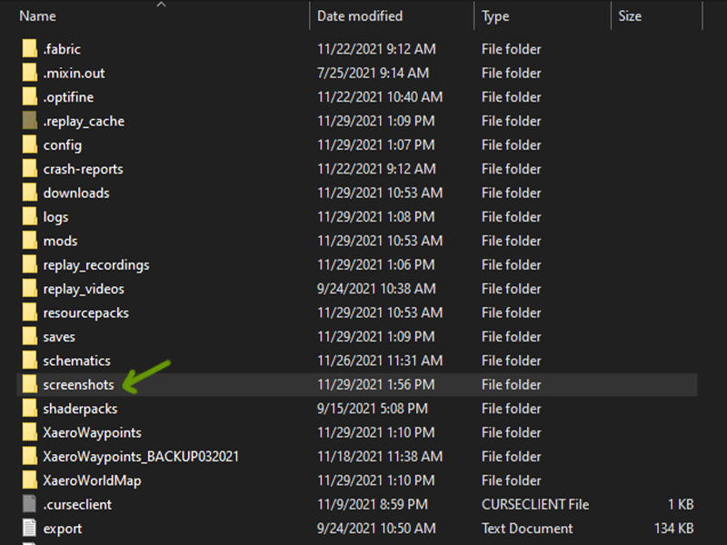 A window will open that shows all the files in the instance you played. Find the Screenshots folder and double click to open it. Within are all the screenshots you made in your worlds!