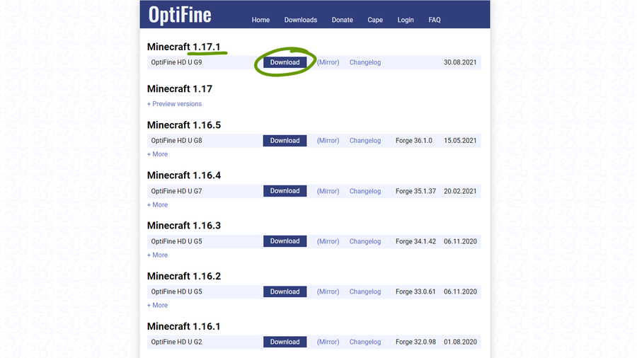 Downloadbutton to the right of the OptiFine version you want. - On the next page, you may need to wait for the