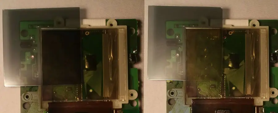 Place the new film behind the Game Boy screen. The polarizing film will appear darker or lighter when rotated 90°. We will need to choose the right orientation for our backlight mod.