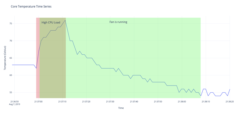 So during my test window, I measured the core Pi temperature every second, and at some point during the window increased the cpu load, hoping to increase the core temperature. At 65° C, I expected the fan to kick on and start cooling off the Pi. Then when I stopped the load test, I expected the temperature to drop quickly. And once it reached 55° C, I expected the fan to turn back off.