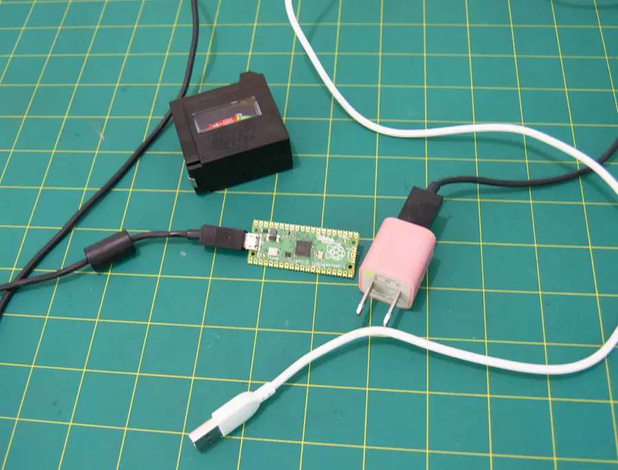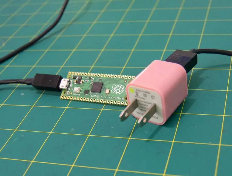 If you have an AC to USB adapter, you can use the micro USB cable to power the Pico in a more permanent configuration. In this setup, the Pico accepts power from the micro USB port with a cable connected directly to a wall outlet.