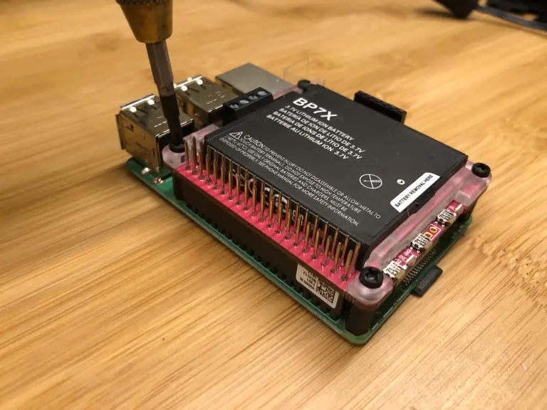 Carefully press the PiJuice onto your Pi’s GPIO header. Then, use the included screws and plastic standoffs to secure it to your Pi.
