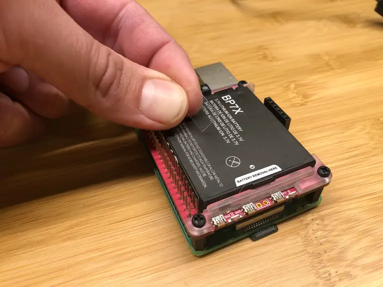 The PiJuice comes with an off-the-shelf battery preinstalled. This is neat because it makes swapping out or replacing the battery super easy — you can even hot-swap batteries as long as your Pi is powered. If your PiJuice came with a battery, be sure to remove the battery’s clear plastic insulation tab.