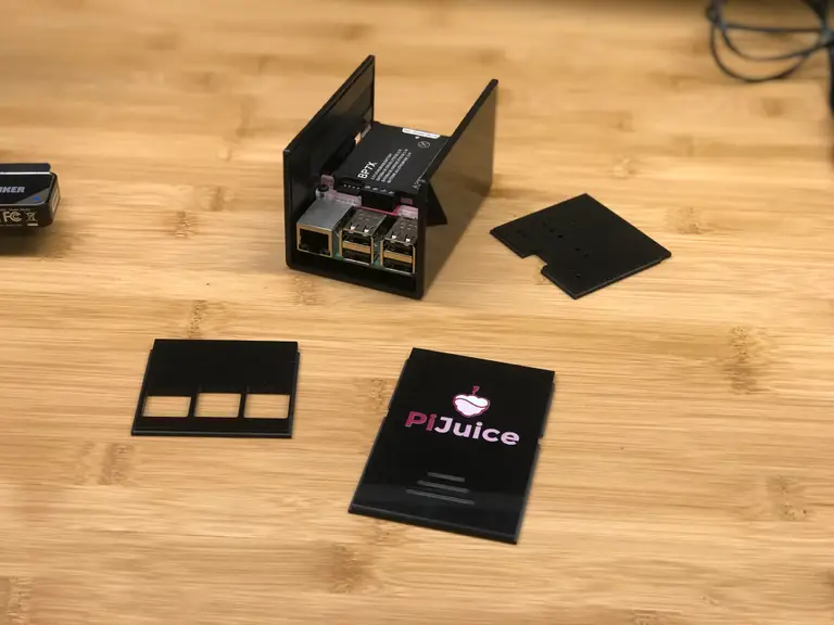 Slide off the top, back, and front of the case. Then, carefully slide the Pi and PiJuice into place. The whole assembly will lock into slots in the sides of the case. Finally, replace the sides and top and connect the 4 rubber feet.