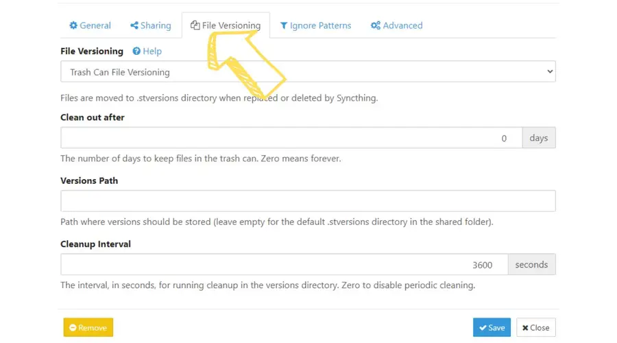 - Under “File Versioning” click the “Trash Can File Versioning” checkbox.