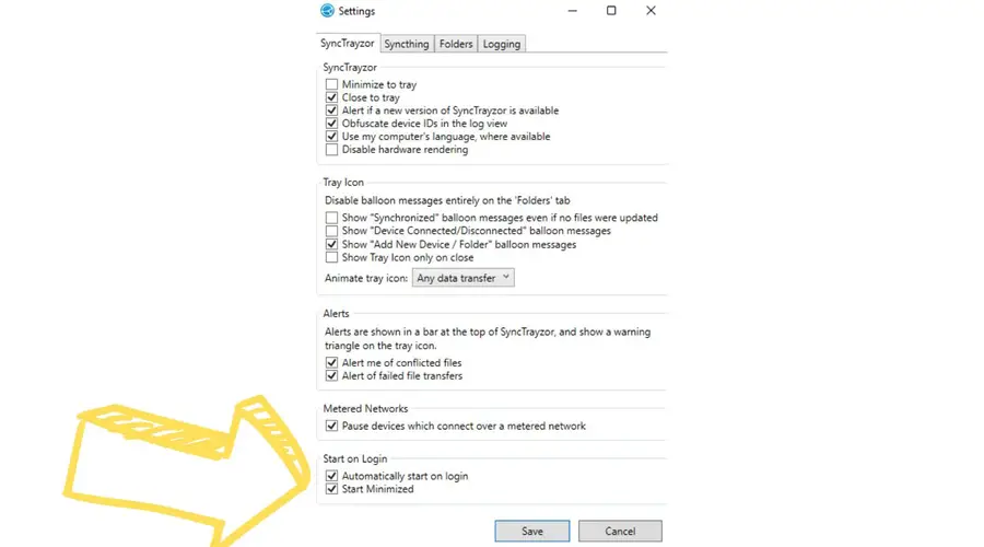 - On the SyncTrayzor tab, at the bottom, you’ll find two setting checkboxes: